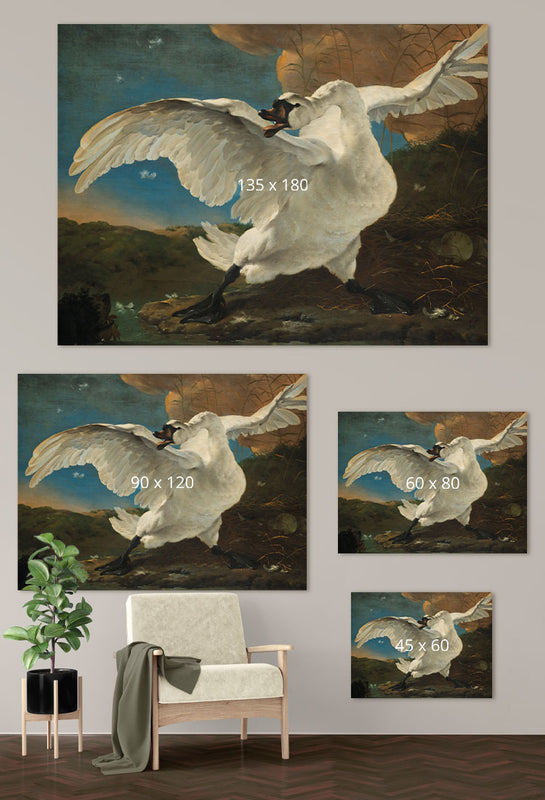 De bedreigde zwaan is een schilderij van de Nederlandse kunstschilder Jan Asselijn, het wordt gezien als zijn grootste meesterwerk. De witte zwaan verdedigd fanatiek haar nest met eieren. Het werk heeft tegenwoordig een allegorische betekenis. De bedreigde witte zwaan staat symbool voor Johan de Witt, die (het nest met de eieren) Holland beschermt tegen de vijanden van de staat, Willem III van Oranje (de zwemmende hond). Nederland was destijds namelijk nog een republiek, de Republiek der Zeven Verenigde Nederlanden. Holland was nog niet meer dan een gewest ter grote van een gemiddelde provincie. Met deze interpretatie is het schilderij in 1800 aangekocht door de nationale kunstgalerie, zo heette het Rijksmuseum vroeger. Jan Asselijn maakte het schilderij rond 1650, twee jaar voor zijn dood. De bedreigde zwaan is geschilderd op doek met olieverf. Aan het schilderwerk zijn, na het overlijden van Asselijn, drie teksten toegevoegd. Onder de knobbelzwaan staat “DE RAAD=PENSIONARIS” waarmee verwezen word naar De Witt. Op een ei staat geschreven, “Holland”. Boven de zwemmende hond staat geschreven “DE VIAND VAN DE STAAT” wat verwijst naar het koningshuis, en dan met name Willem III van Oranje Nassau. Men was bang voor de gegroeide macht van Oranje en de dreigende oorlogsdreiging die hiermee gepaard ging. Wie de opschriften heeft toegevoegd is onbekend. Het werk wat door ons wordt aangeboden is een digitaal verbeterde versie van het origineel. De pixels zijn verwijderd waardoor de afbeelding haarscherp is, ook zijn de opschriften verwijderd waardoor het werk weer in originele staat is teruggebracht.